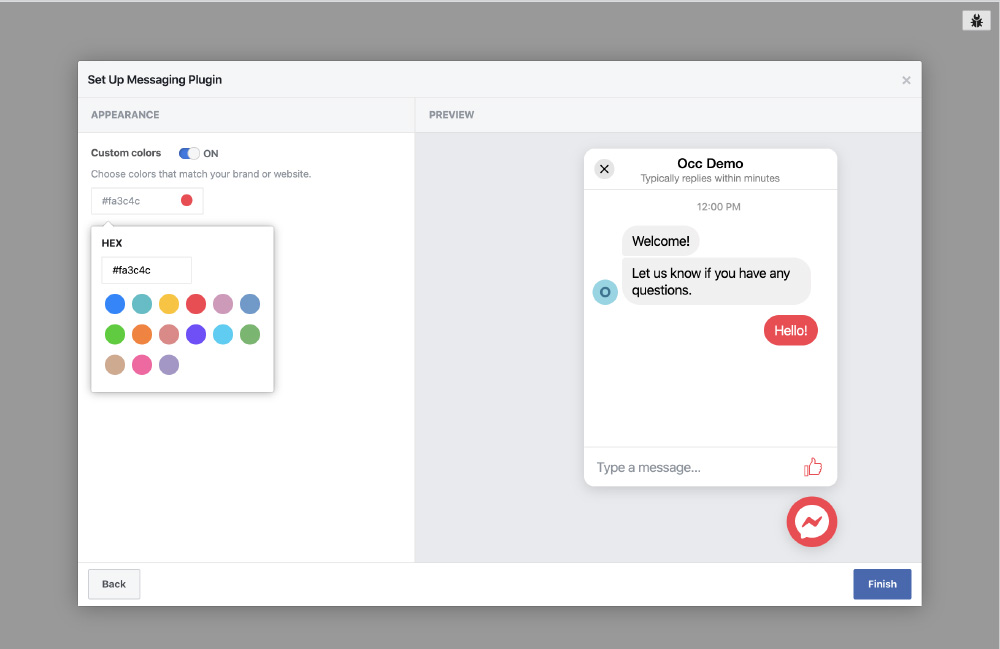 Il suo lavoro viene svolto tramite una finestra di dialogo su Facebook.com ma, una volta terminato aggiorna le opzioni del plugin fbmcc_pageID e fbmcc_locale per impostare l’ID della pagina che verrà collegata al pop-up della chat nel front-end del sito, compresa la lingua che dovrebbe essere usata.